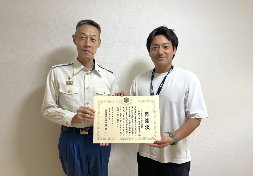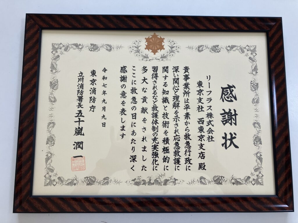 このたび、当社西東京支店が立川消防署より感謝状をいただきました。