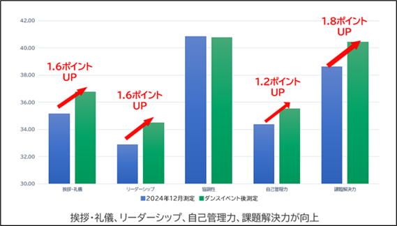 当社が開発した非認知能力測定システム「みらぼ」を活用し、2024年12月の測定とダンス発表会後に測定を比較検証した結果、子どもたちの非認知能力が向上したことが明らかになりました。