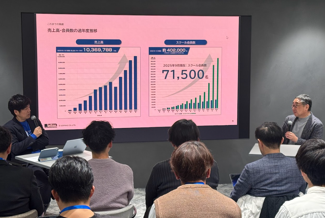 当日は、時価総額1,000億円企業の達成経験を持つ「Nマイナス」代表・伊藤雅仁氏との対談形式で講義が行われました。対談内では、当社の創業から、ソーシャルビジネスとして持続可能な収益モデルを確立するまでの軌跡、そして2025年に果たした米国NASDAQ市場への上場(IPO)に至るまでのファイナンス戦略や、数々の困難をどのように乗り越えてきたかについて、実体験に基づいたお話をさせていただきました。